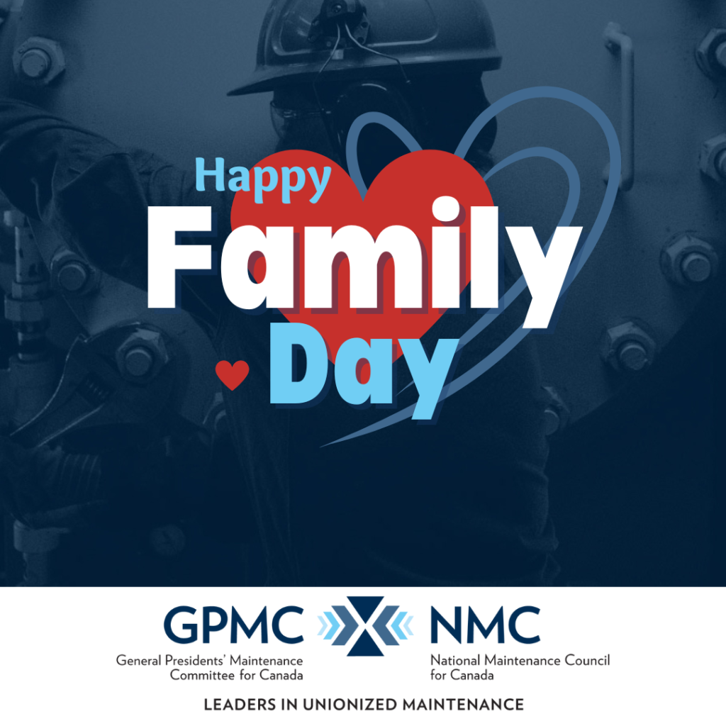 The General Presidents’ Maintenance Committee for Canada and National Maintenance Council for Canada (GPMC/NMC) wishes everyone in ON, AB, BC, NB, and SK a safe and happy Family Day, and sends warm wishes to MB as they observe Louis Riel Day, PEI for Islander Day, and NS for Heritage Day.