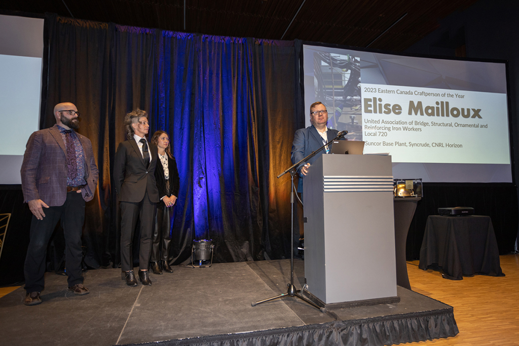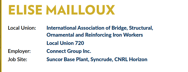 Elise is a Journeyperson Iron Worker working for Connect Group Inc (CGI) at Suncor. She took an unconventional career path from hospitality, to carpentry to roofing before she was introduced to iron work. She discovered iron work was her passion after taking a course and apprenticeship in welding and ornamental/structural iron working. Elise became the first fully certified female ironworker in 1998.
