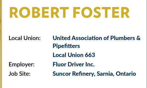Bob’s inspiration for his career came from his father, who was also a UA pipefitter. He learned from his dad’s success and has worked hard to follow in his footsteps. Bob has been happily married to his wife, Les Foster, for 32 years, and they have two sons who both served in the Canadian Armed Forces.